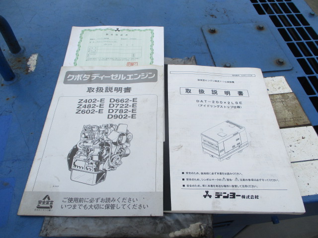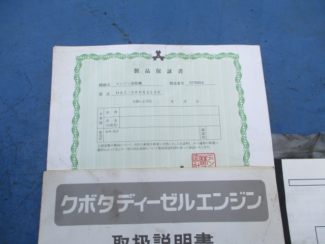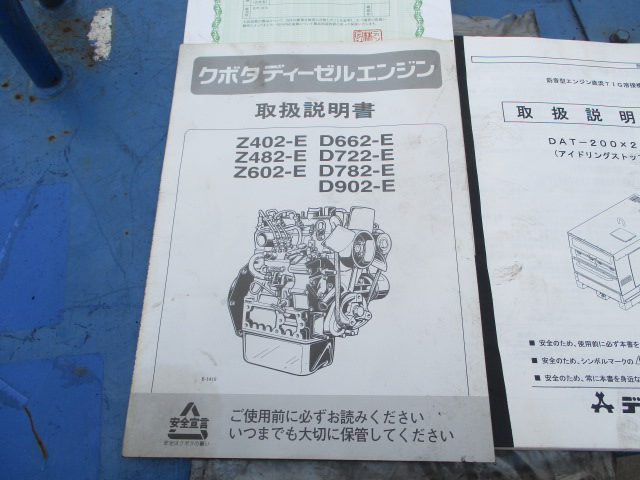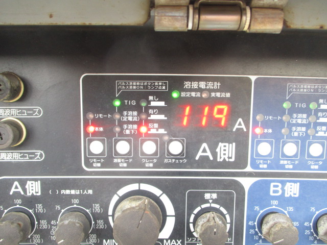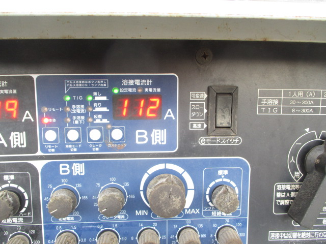 | 仕様(Spec) | ディーゼルエンジンTIG溶接機 ・TIG 1人300A 2人同時200A パルス溶接等様々な溶接パターンが可能 ・手棒(アーク) 1人260A 2人同時150A 2~6(5)mmまでの棒使用可能 ・発電 単相100V 50/60HZ切替付き ・エンジン クボタD902ディーゼルエンジン(3次排ガス規制) ・エコベース(水やオイル受け)・eモード(スローダウン等)・アイドリングストップ等多機能 ・寸法(mm) L1500 W720 H1090 ・整備重量 480kg 発電~アーク溶接動作確認済み、程度良好 参考新品価格:210万円前後 |